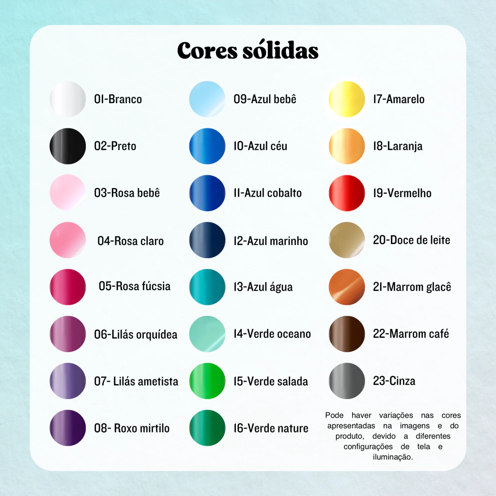 01-Branco 02-Preto 03-Rosa bebê 04-Rosa claro 07-Lilás ametista 09-Azul bebê 10-Azul céu 14-Verde oceano 15-Verde salada 16- Verde nature 17-Amarelo 18-Laranja 19-Vermelho 20-Doce de leite 21-Marrom glacê 24-Prata holográfico 27-Branco holográfico 29-Dourado metalizado 30-Prata metalizado